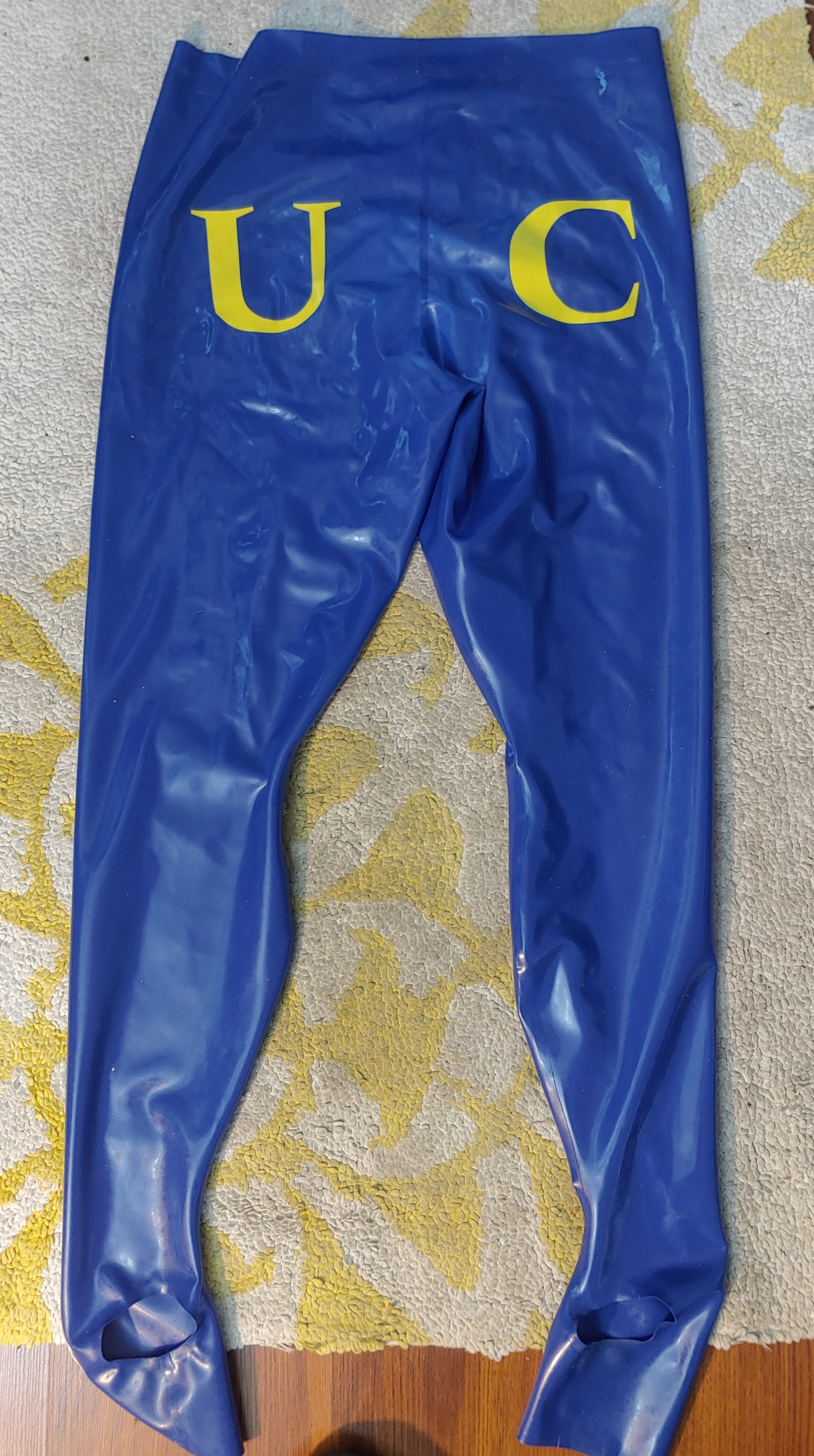 1. main color of the pants in dark blue and yellow letters.
